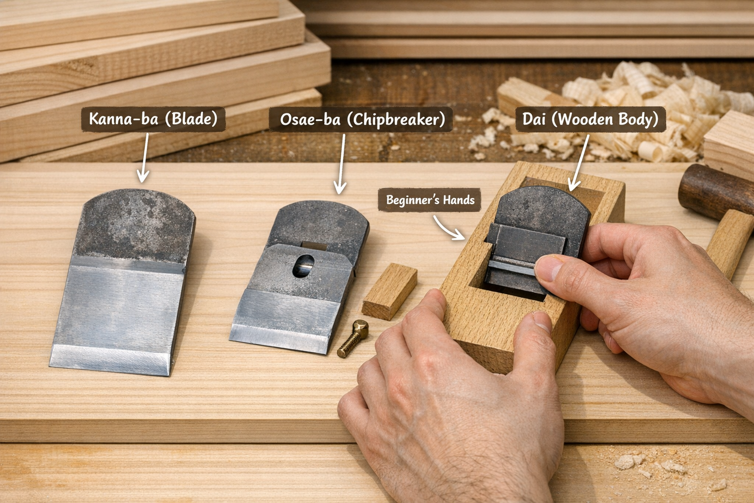 - The Dai (Body): This is the wooden block, typically made from hard, stable wood like Japanese white oak. It’s the housing for the blade and chipbreaker, and its precisely machined sole is what glides over the wood. The dai’s sole usually has specific relief cuts (known as uragane and maetana) to reduce friction and improve cutting performance.