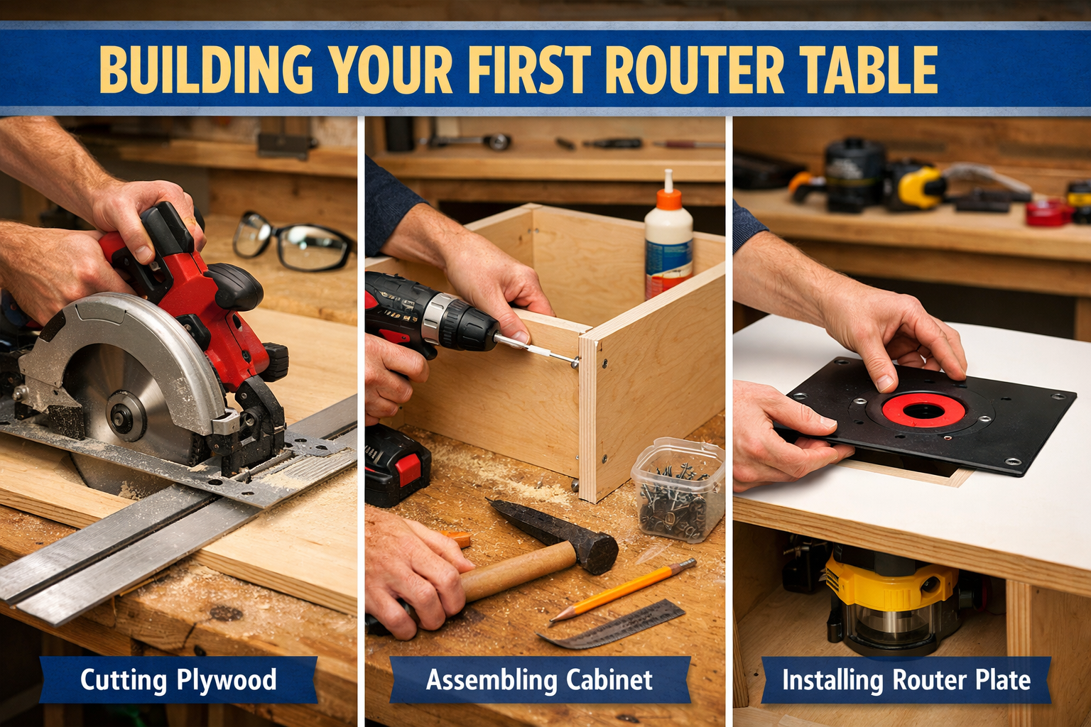 image demonstrating key construction steps for a DIY router table. This composite image shows three distinct stages: 1)](https://zsxkvszxbhpwnvzxdydv.supabase.co/storage/v1/object/public/generated-images/kie/2509b5d6-c8e9-4d1e-96ab-a30d01274fae/slot-2-1776573211399.png))