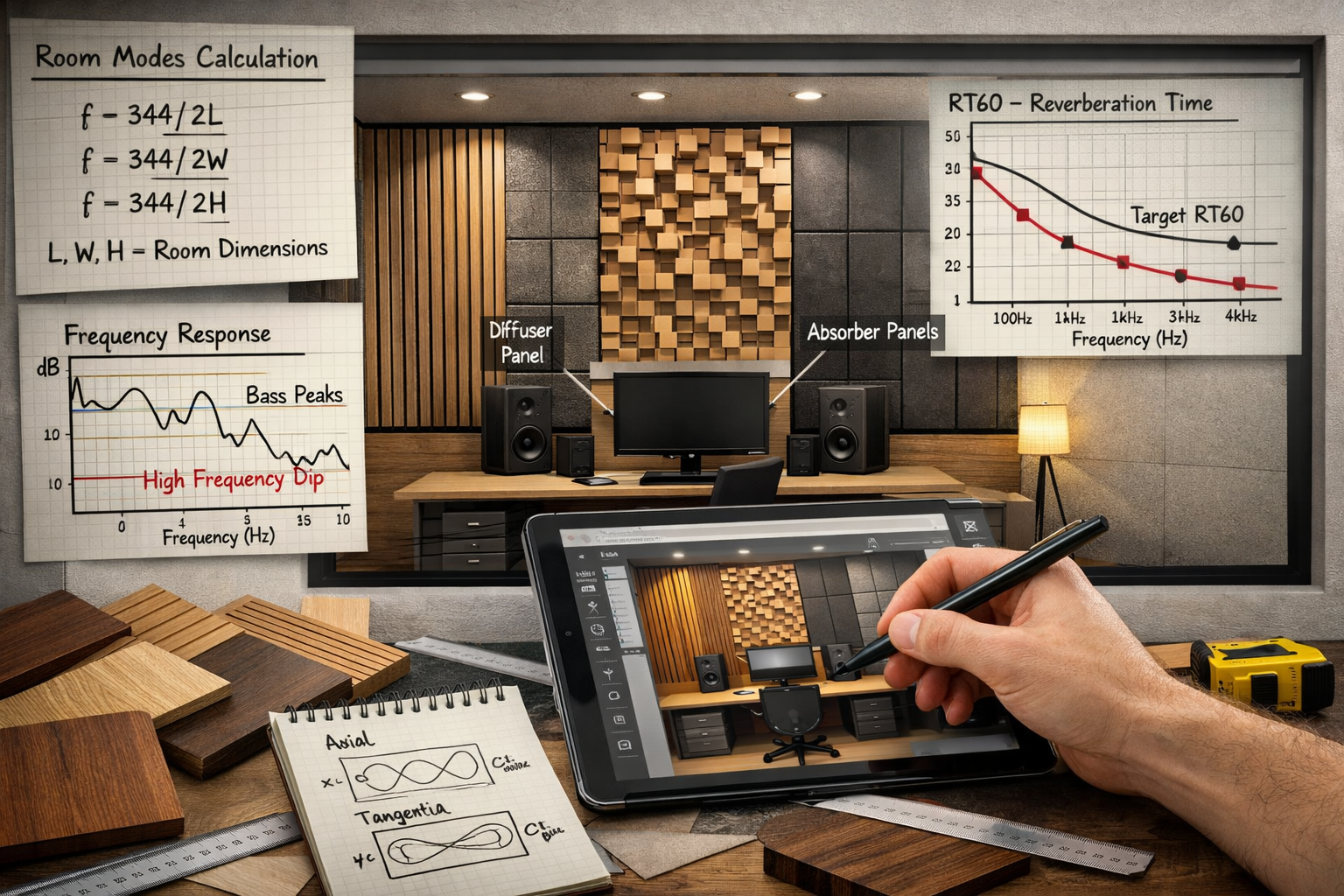• Home Office: Focus on clear voice communication for calls and reducing distractions. A balance of absorption, particularly at the first reflection points (the spots on walls where sound hits before reaching your ears), and some diffusion for a natural sound.