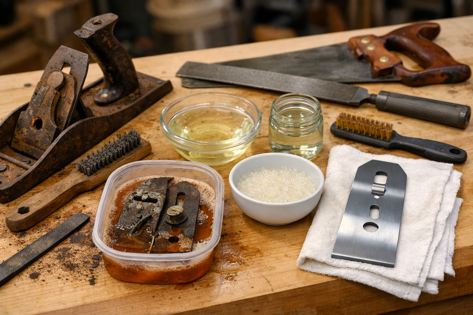 - Wire Brushes and Abrasives: For light rust, a brass wire brush (manual or on a drill) can be effective. Sandpaper (starting coarse, moving to fine grits) can remove rust and smooth surfaces, especially for plane soles and chisel backs.