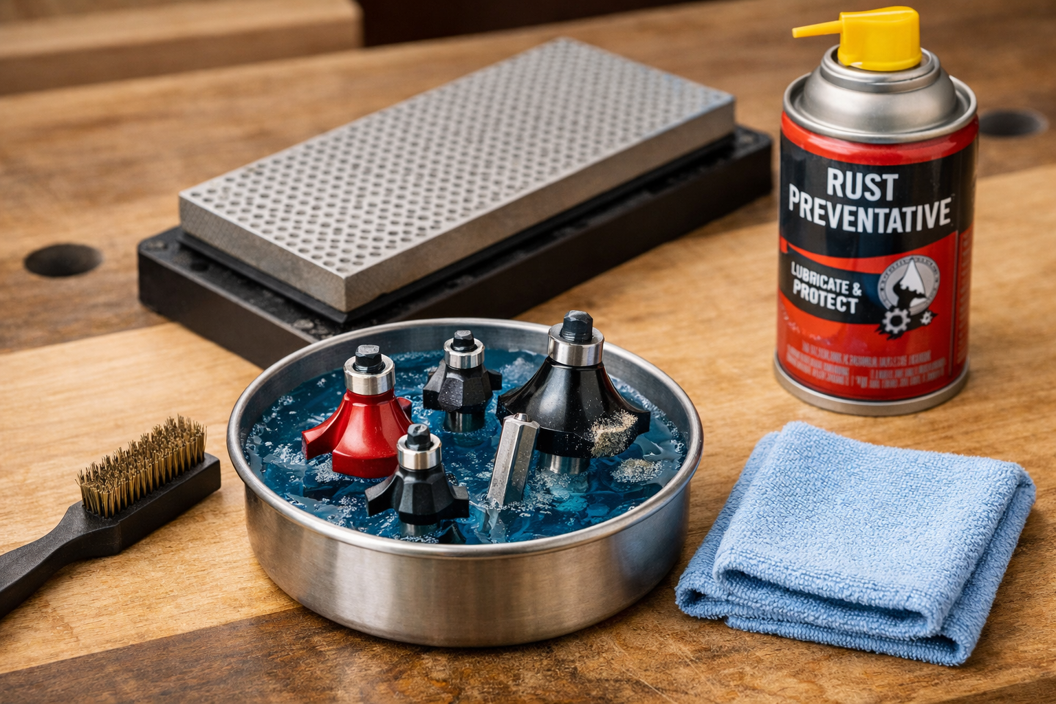 - Soak: Submerge the bit (excluding bearings, which can be damaged by solvents) in a specialized router bit cleaner or a household degreaser like Simple Green. Allow it to soak for 10-15 minutes.